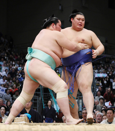 大相撲九州場所14日目。琴桜(左)は寄り切りで大の里を破り、勝ち越しを決める=22日、福岡国際センター 【時事通信社】