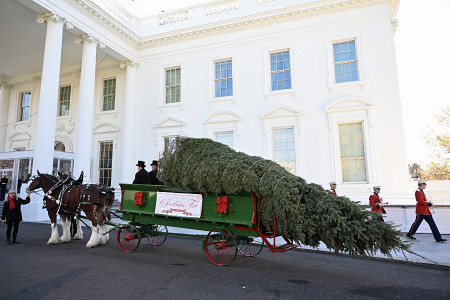 24日、米ホワイトハウスに運び込まれるのはクリスマスツリー用のもみの木。高さは約7・6メートルで、年末のホリデーシーズンの間、外国の要人らを迎え入れる「青の間」に飾られる。 【AFP時事】