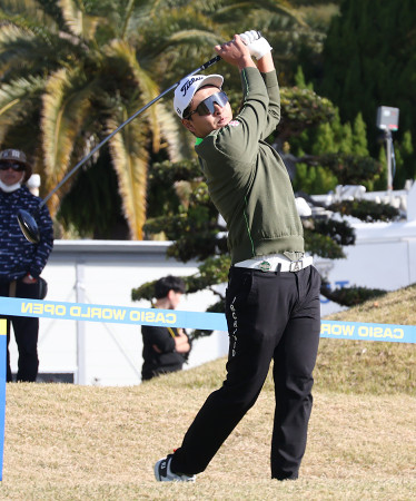 カシオ・ワールドオープン第2日。ティーショットを放つ鈴木晃祐。65で回り、通算14アンダーに伸ばして首位に立った=28日、高知・Kochi黒潮CC 【時事通信社】