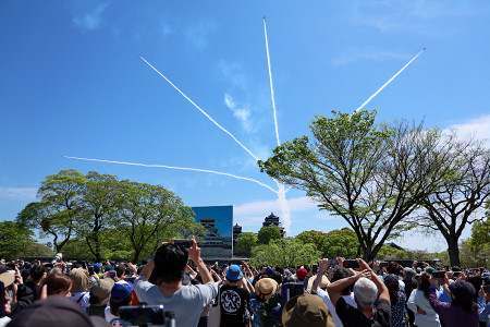 熊本地震から10年となるのを前に、航空自衛隊の曲技飛行チーム「ブルーインパルス」が11日、復興の願いを込めた飛行を披露。白いスモークをたなびかせて桜の花などが描かれると、観覧者からの拍手に包まれた。 【時事通信社】