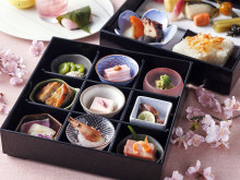35階のレストラン&バー「SKY J(スカイジェイ)」では、地上150メートルからの眺望とともに楽しんでもらうランチビュッフェ(3,600円)を提供。「鴨肉のロースト ベリーソース」「桜海老(えび)香る炒め焼きそば」、桜のロールケーキなどが並ぶ。同フロアのスカイレストラン「丹頂」では、桜鯛(だい)やタケノコなど季節の味覚を詰めた「季節の二段重~さくら~」(3,800円)を用意する。
