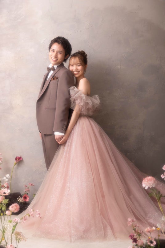 柔らかなピンクカラーのウェディングドレスは、多くの花嫁にとって憧れの存在。