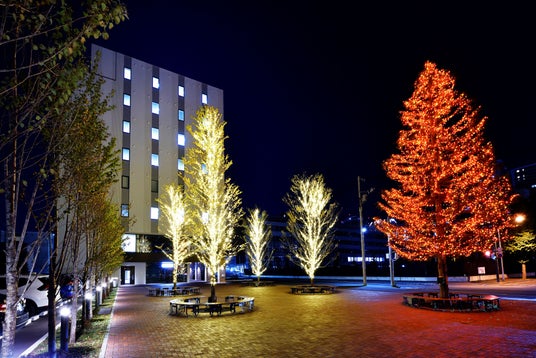 創成クロスでは、北5条通のレンガ舗装の屋外広場でイルミネーション装飾を実施します。高さ約12メートルのアカエゾマツを中心とした樹木に、約18,000個のLEDイルミネーションで装飾し、創成イーストエリアのシンボルとして、赤・オレンジ・ゴールドの光で輝かしい空間を演出します。