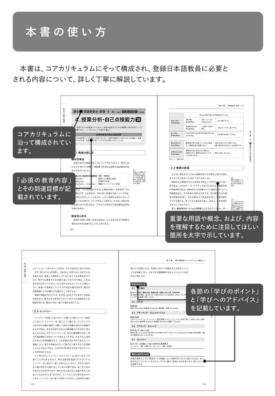 ●養成課程コアカリキュラムの全項目を網羅的に解説しているため、入門者から現役教師、学び直しの方まで日本語教育に必要な知識をこの1冊で体系的に学習できる