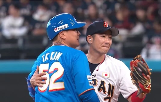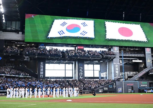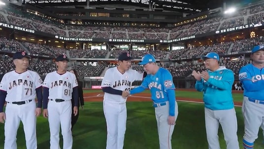 日韓両国のビッグフラッグがフィールドに掲げられたオープニングセレモニーでは、両国の選手が久しぶりの再会に顔をほころばせ、握手やハグを交わしながら入場。マウンドを囲む形で肩を組んで両国の友情を誓い合うシーンが大変印象的でした。