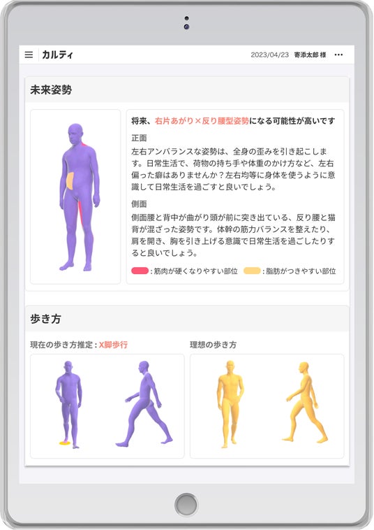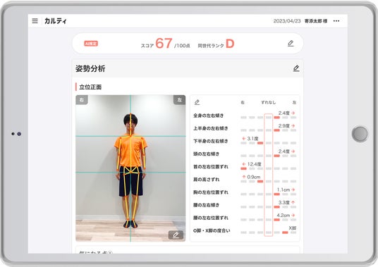 「カルティ シセイカルテ」は、タブレットで数枚の写真を撮影するだけでAIが姿勢を分析し、スコアやグラフで可視化するシステムです。健康経営やカウンセリングなど、さまざまな現場で活用が広がっています。さらに、歩行動画を撮影することで、歩行速度や歩幅、バランスなどの客観的な指標を数値化し、歩行スコアや転倒リスクの評価も可能です。