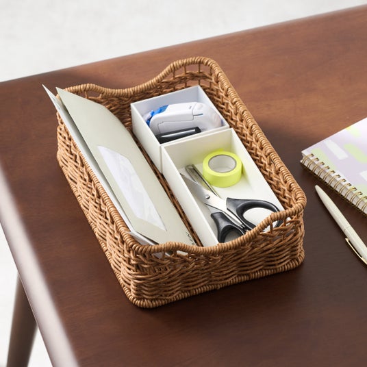 リビングで。手紙や文房具、リモコンなどをひとまとめ。散らかりがちなテーブルが、すっきり見える。