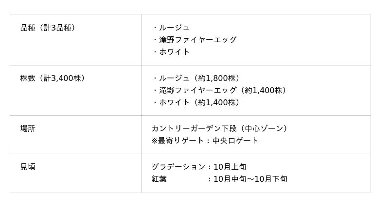 また、今年は定番の紅葉品種「ルージュ」や滝野オリジナル品種「滝野ファイヤーエッグ」に加え、紅葉しない品種「ホワイト」が初登場!緑色から徐々にベージュ色に変化する品種で、今年の紅葉時期には、真紅とベージュのコキアが創り出す新たな紅葉風景をご覧いただけます。
