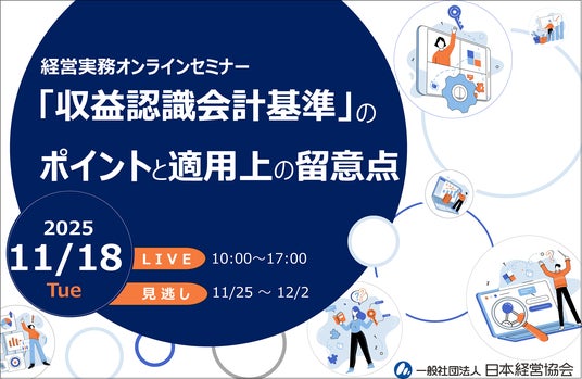 一般社団法人日本経営協会(本部事務局:東京都渋谷区、会長:高原 豪久)は、経理・財務、経営管理、監査部門の実務担当者を対象とした「収益認識会計基準」に関するオンラインセミナーを2025年11月18日(火)に開催いたします。