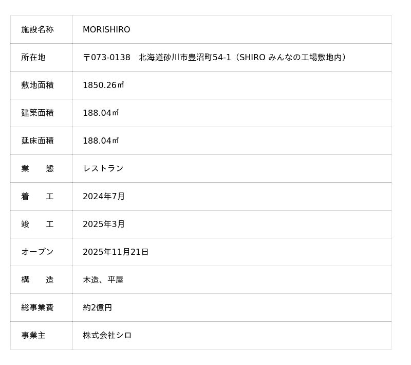 2025年11月21日、北海道砂川市「みんなの工場」の敷地内にイノベーティブレストラン「MORISHIRO」をオープン予定。北海道の森にある貴重な食材を余すことなく料理するレストラン。11月7日からTableCheckにて予約をスタートしている。