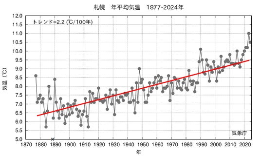 札幌管区気象台の調査によると、札幌管内の年平均気温はさまざまな変動を繰り返しながらも上昇傾向が明らかで、100年間で2.2℃以上高くなっています。