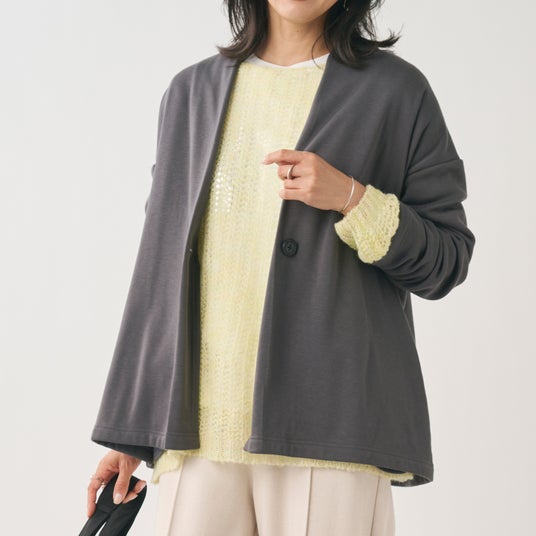 前立てを省いたすっきりデザインに、ワンボタンのアクセントでこなれ感をプラス。コートの下でももたつかず、シンプルなのに印象的なスタイルを叶えます。肩の力を抜いたリラックス感と、計算された美しさを兼ね備えた一枚です。