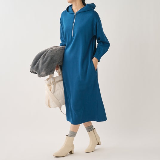 フード付きで首元も暖かく、ハーフジップで今年らしさもありつつ大人女性が似合うデザインに。ワイドすぎないシルエットは室内でも動きやすく、コートを羽織ってもスッキリまとまります。シンプルなのに、どこかこなれた雰囲気を纏える一枚です。