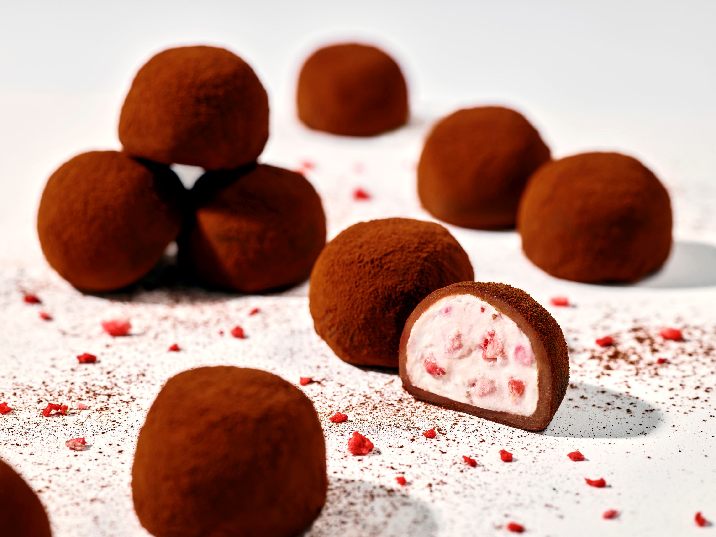 北海道産いちご等をフリーズドライした甘酸っぱいいちごと、まろやかなチョコレートの味わいが特徴の生トリュフチョコレートです。