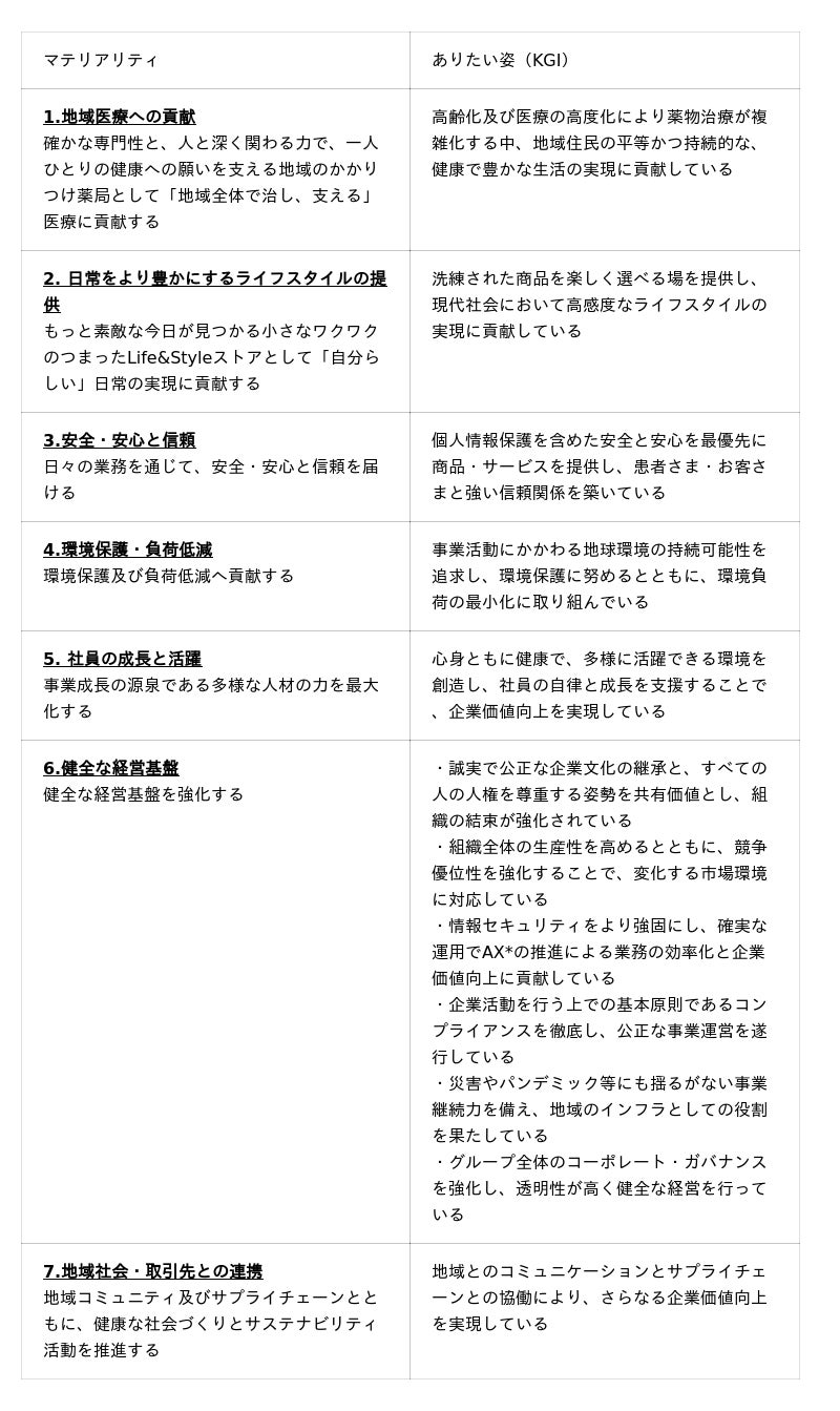 アイングループは、「この街にアインがあってよかった」と感じていただける企業の実現に向け、2020年にマテリアリティを特定し、サステナビリティ経営に取り組んできました。今回、新たな社会課題の顕在化等による外部環境の変化とアイングループ中長期ビジョン「Ambitious Goals 2034」(以下、中長期ビジョン)の公表を踏まえ、当社グループが取り組むべきマテリアリティを見直しましたので、お知らせいたします。