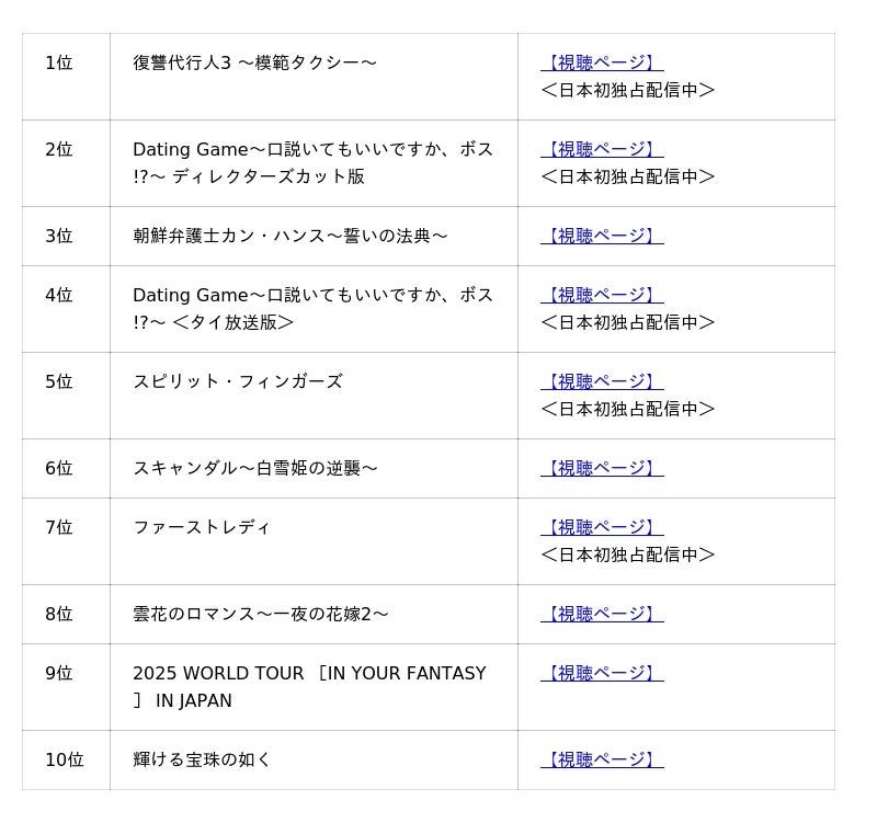 NTTドコモの映像配信サービス「Lemino(R)」は、2025年11月の韓流・アジアコンテンツの月間視聴数を集計し、「Lemino人気作品月間ランキング」を発表いたします。11月は、”模範タクシー”に乗る秘密のプロフェッショナル集団が弱者に代わって法では裁けない悪に復讐するアクションエンターテインメント『復讐代行人3 ~模範タクシー~』が初の1位にランクインしました。
