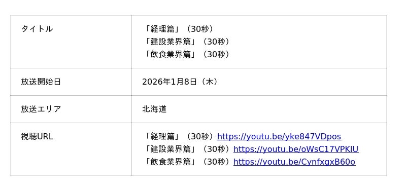 デジタルの力であらゆる業務を効率化する株式会社インフォマート(本社:東京都港区 代表取締役社長:木村 慎、以下「当社」)は、お笑いコンビ「錦鯉」を起用した、当社が提供する「BtoBプラットフォーム」の新テレビCM「経理篇」「建設業界篇」「飲食業界篇」の3本を、2026年1月8日(木)より北海道で順次放送開始します。