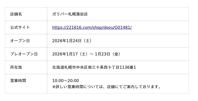株式会社IDOM(本社:東京都千代田区丸の内二丁目7-2 JPタワー26階、以下:IDOM)はガリバーブランドの新店舗として、2026年1月24日(土)に「ガリバー札幌藻岩店」(北海道札幌市)をオープンいたします。本店舗の出店により、札幌市内にあるガリバーの大型店舗は4店舗目となります。