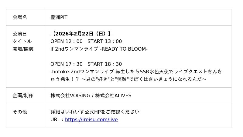 2ndソロアルバムのリリースを記念し、2026年2月22日(日)豊洲PITにて、If・-hotoke-それぞれのソロワンマンライブを開催いたします。昼公演には、Ifによる「If 2ndワンマンライブ -READY TO BLOOM-」を開催します。“咲く準備はできている”というタイトルが示す通り、これまで積み重ねてきた努力を糧に、次のステージへと踏み出すIfの現在地をお届けいたします。さらに、夜公演では、-hotoke-による「2ndワンマンライブ 転生したらSSR水色天使でライブクエストきんきゅう発生!? ~君の"好き"と"笑顔"でぼくはさいきょうになれるんだ~」を開催します。独自のユーモアと世界観を全面に押し出したタイトルそのままに、音楽、演出、物語性が融合した“水色の冒険譚”をお届けいたします。
