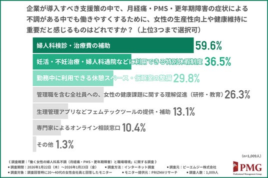「企業が導入すべき支援策の中で、月経痛・PMS・更年期障害の症状による不調がある中でも働きやすくするために、女性の生産性向上や健康維持に重要だと感じるもの」について尋ねたところ、『婦人科検診・治療費の補助(59.6%)』が最も多く、『妊活・不妊治療・婦人科通院などに利用できる特別休暇制度(36.5%)』『勤務中に利用できる休憩スペース・仮眠室の整備(29.8%)』と続きしました。