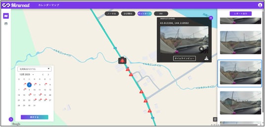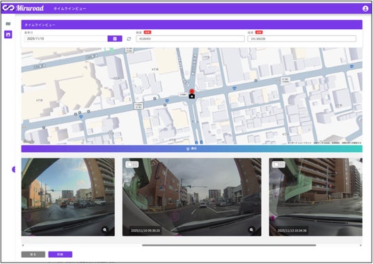 Miruroadは通信型ドライブレコーダーとして常設でき、走行中のすべての映像をエッジAIで解析し、時系列で記録する仕組みを備えています。これにより、必要部分のみをクラウドへ送る方式では難しかった任意地点の振り返りや、事故前後・経年劣化の把握が容易になり、日々の走行が道路状態を示す客観的な記録として着実に蓄積されます。