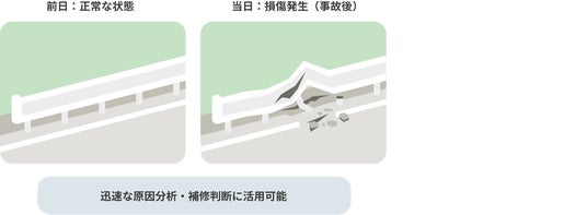 同様に、事故発生前後の変化をすぐに比較でき、損傷の原因分析を迅速に行えます。また、事故前後を明確に判別できることは国土交通省中部地方整備局の技術試行でも重視されており、本機能はその要件に沿うものとして期待されています。
