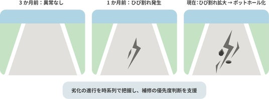 走行映像が自動で蓄積されるため同一地点の路面状況を時系列で比較できます。「異常なし → ひび割れ → 一部がポットホール化」へと変化する進行プロセスが直感的に把握でき、補修の優先度判断を容易にします。