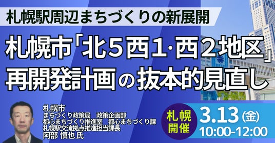 JPI(日本計画研究所)は、札幌市 まちづくり政策局 政策企画部 都心まちづくり推進室 都心まちづくり課 札幌駅交流拠点推進担当課長 阿部 慎也 氏を招聘し、「北5西1・西2地区」再開発計画の抜本的見直しと札幌駅周辺まちづくりの新展開について詳説いただくセミナーを開催します。