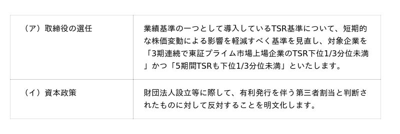資本効率や株価を意識した経営を促す観点から導入した指標の見直しなどを行うとともに、2024年9月27日に公表した中長期視点に基づくスチュワードシップ活動(議決権行使・エンゲージメント)ロードマップを踏まえ、今般の2026年4月の改定に加えて、2027年4月に改定を予定している事項についても本文に掲載いたします。