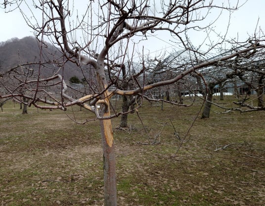 【被害の実態】樹皮が完全に剥がされ、立ち枯れの危機にある果樹。