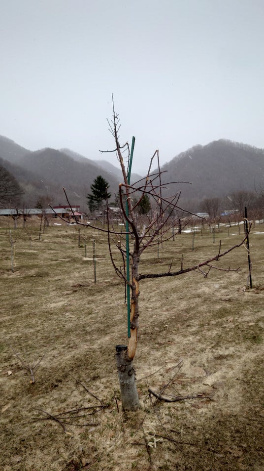 シカに芽を食われ、樹皮を剥がされ、傷ついた果樹。